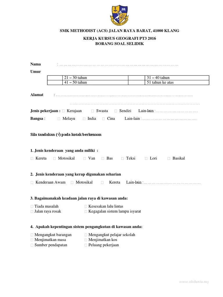 Smk methodist (acs) jalan raya barat, 41000 klang kerja kursus geografi pt3 2016 borang soal selidik nama Borang soal selidik pengangkutan awam. Soal selidik docx kerja lapangan geografi tingkatan 2 2019 borang soal selidik a . Borang soal selidik sistem pengangkutan awam geografi tmn klang jaya. Umur 21 30 tahun 31 40 tahun 41 50 tahun 51 tahun ke atas. Contoh penulisan kaedah kajian kerja kursus geografi 2013.